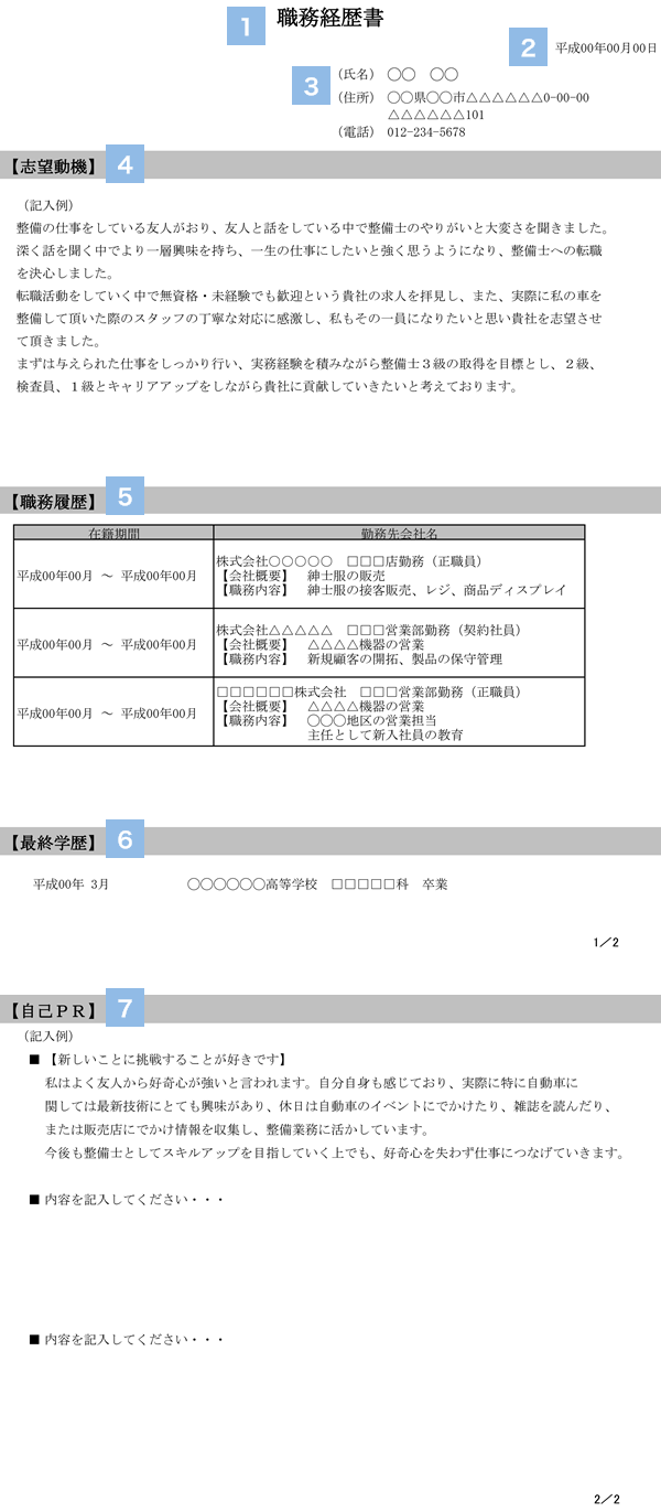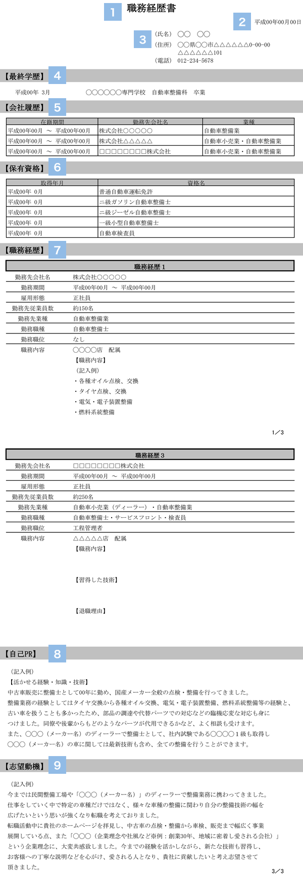整備士の転職の時に役に立つ職務経歴書の書き方や注意点、テンプレートやサンプル例文集を集めました。「どう書いたらいいの?」「手書きで書くの?」など、整備士の転職に特化したクラッチ求人編集部が、今すぐ使える職務経歴書をご用意しましたので活用して下さい。
